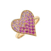14k yellow gold heart ring with pink sapphires weighing 0.85cts. Please allow 4-6 weeks as each piece is made to order.