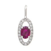 14k white gold diamond and ruby pendant on an 18" cable chain. There are 20 diamonds weighing 0.06cts and one ruby weighing 0.22cts.