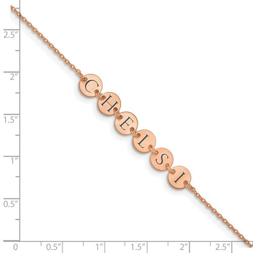 Personalized disc bracelets available in sterling silver, gold plated, rose gold plated, 14k white gold, 14k rose gold and 14k yellow gold.