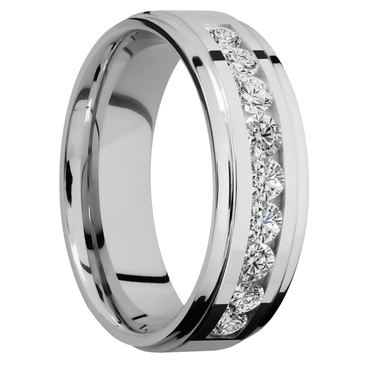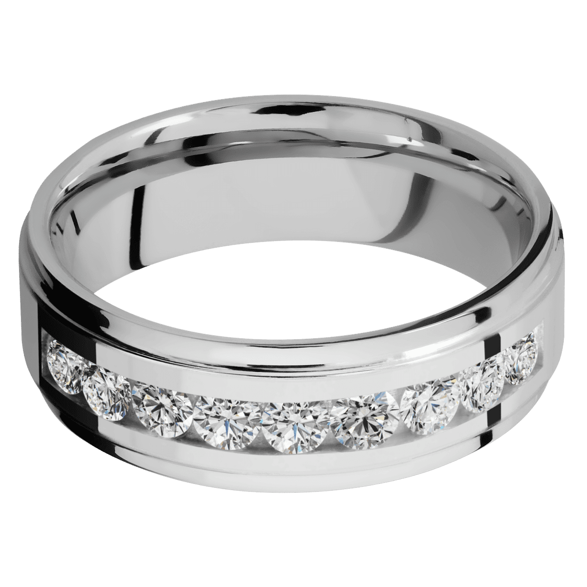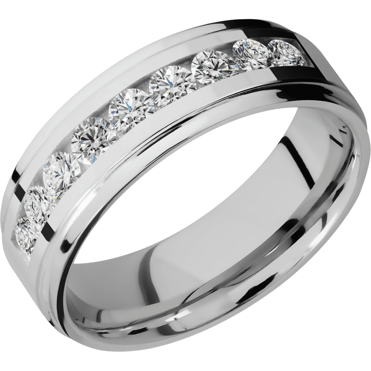 Cobalt Chrome with Polish , Polish Finish - 7 mm wide/Flat Grooved Edges/Cobalt Chrome band with an arrangement of 9, .1 carat Round Diamond stones in a Channel setting. - TCW 0.9ct. - TCW 0.9ct.
