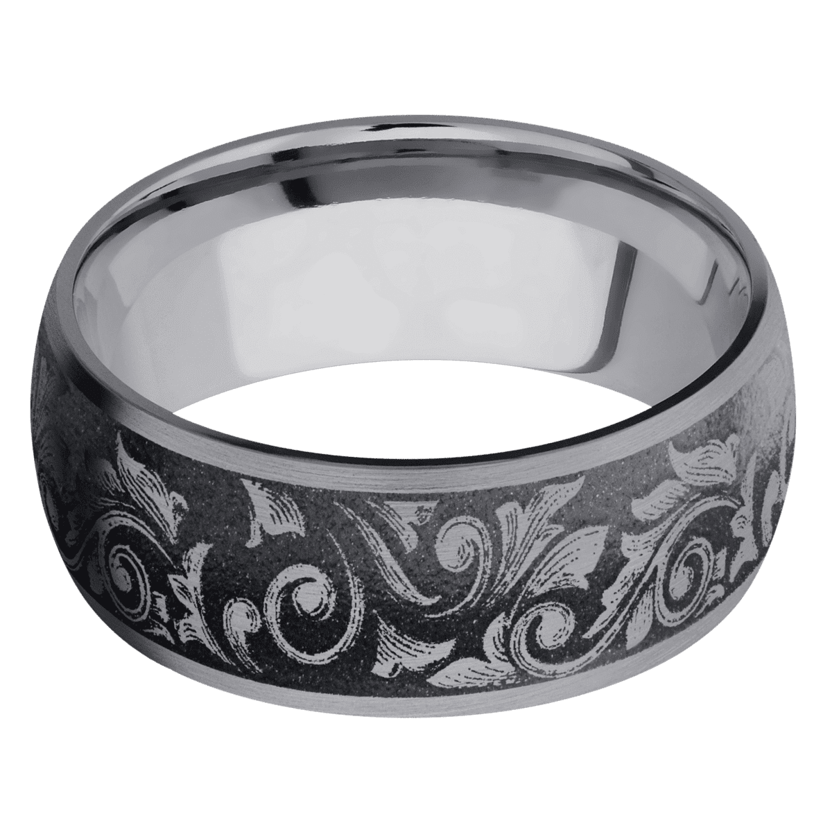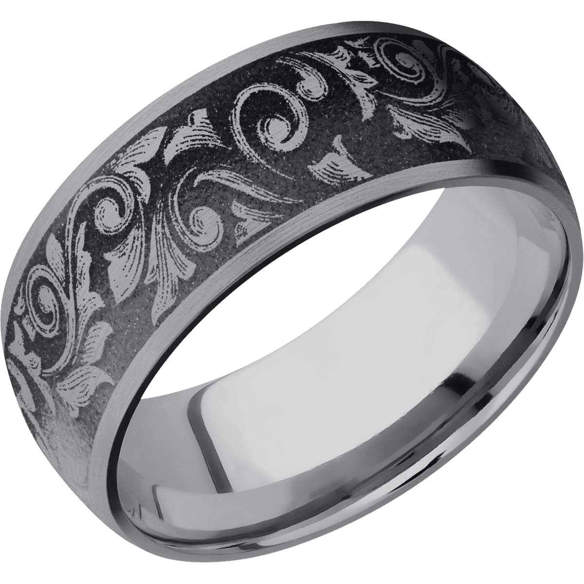 9 mm wide/Domed/Tantalum band with a laser carved Western Scroll pattern.