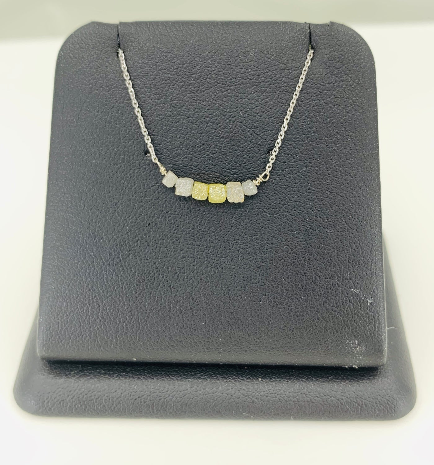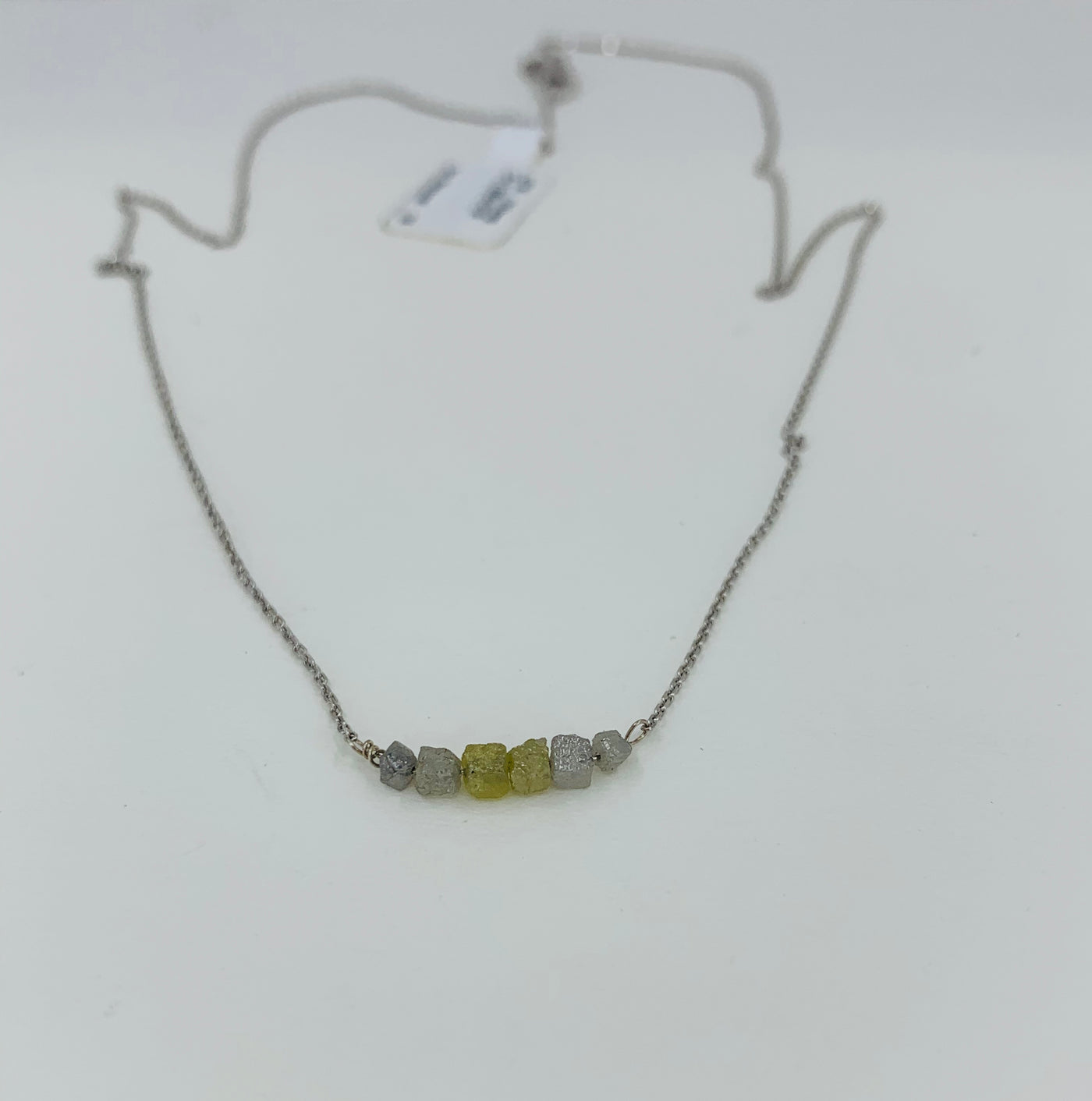 14kt white gold with 1.00ct of rough cut diamonds. 18” cable chain