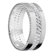 14K White Gold with Satin Finish - 8 mm wide/Flat/14K White Gold band with a Side Eternity arrangement of .01 carat Round Diamond stones in a Bead Channel setting and featuring a a 2 Row Eternity arrangement of .015 carat Round Diamond stones in a Bead Channel setting - TCW 2.25ct.