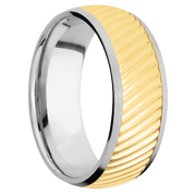 14K White Gold with Satin Finish and 14K Yellow Gold Inlay - 8 mm wide/Domed/14K White Gold band with one 6 mm Centered inlay of 14K Yellow Gold with a machined Ripple pattern.