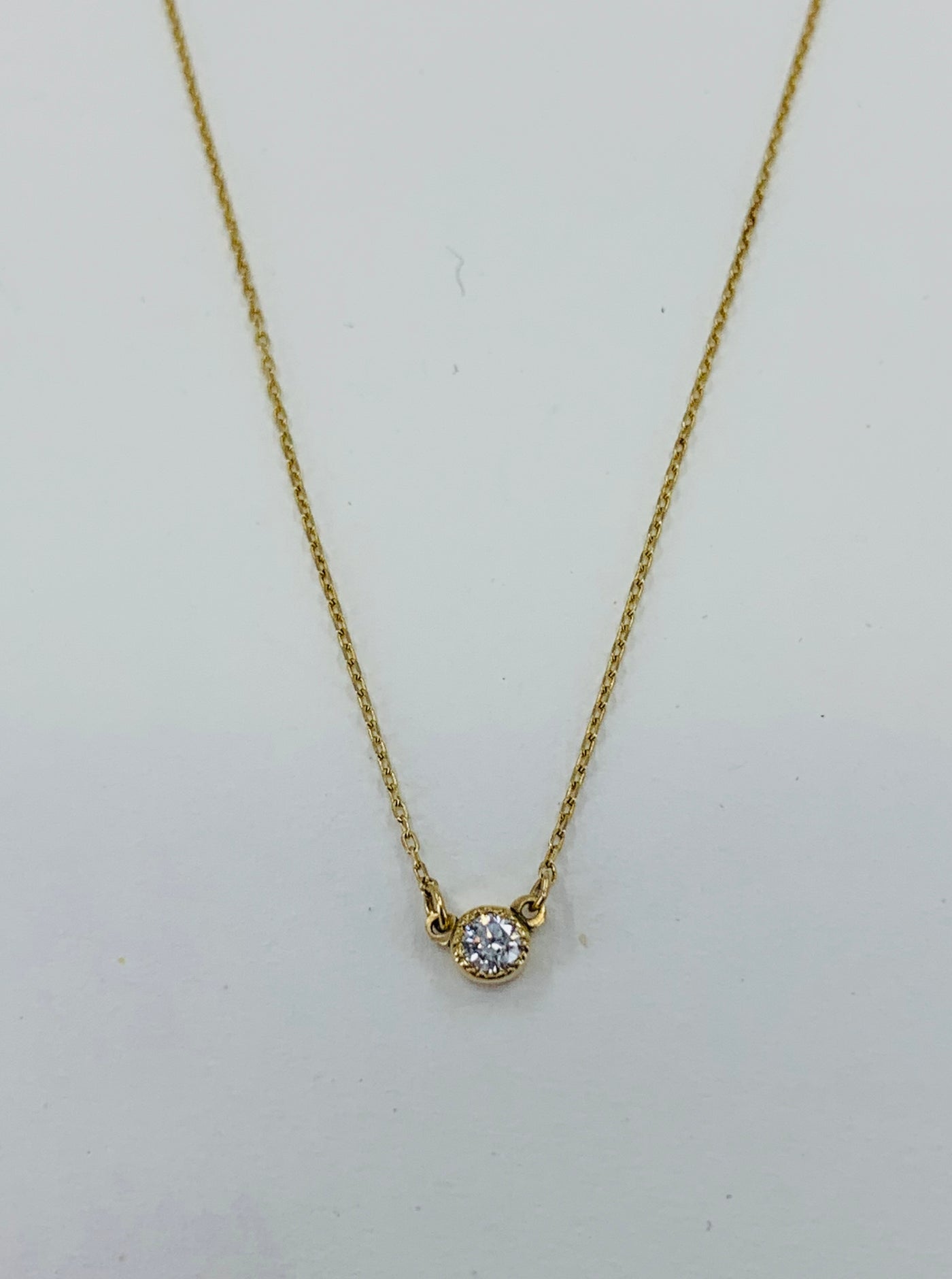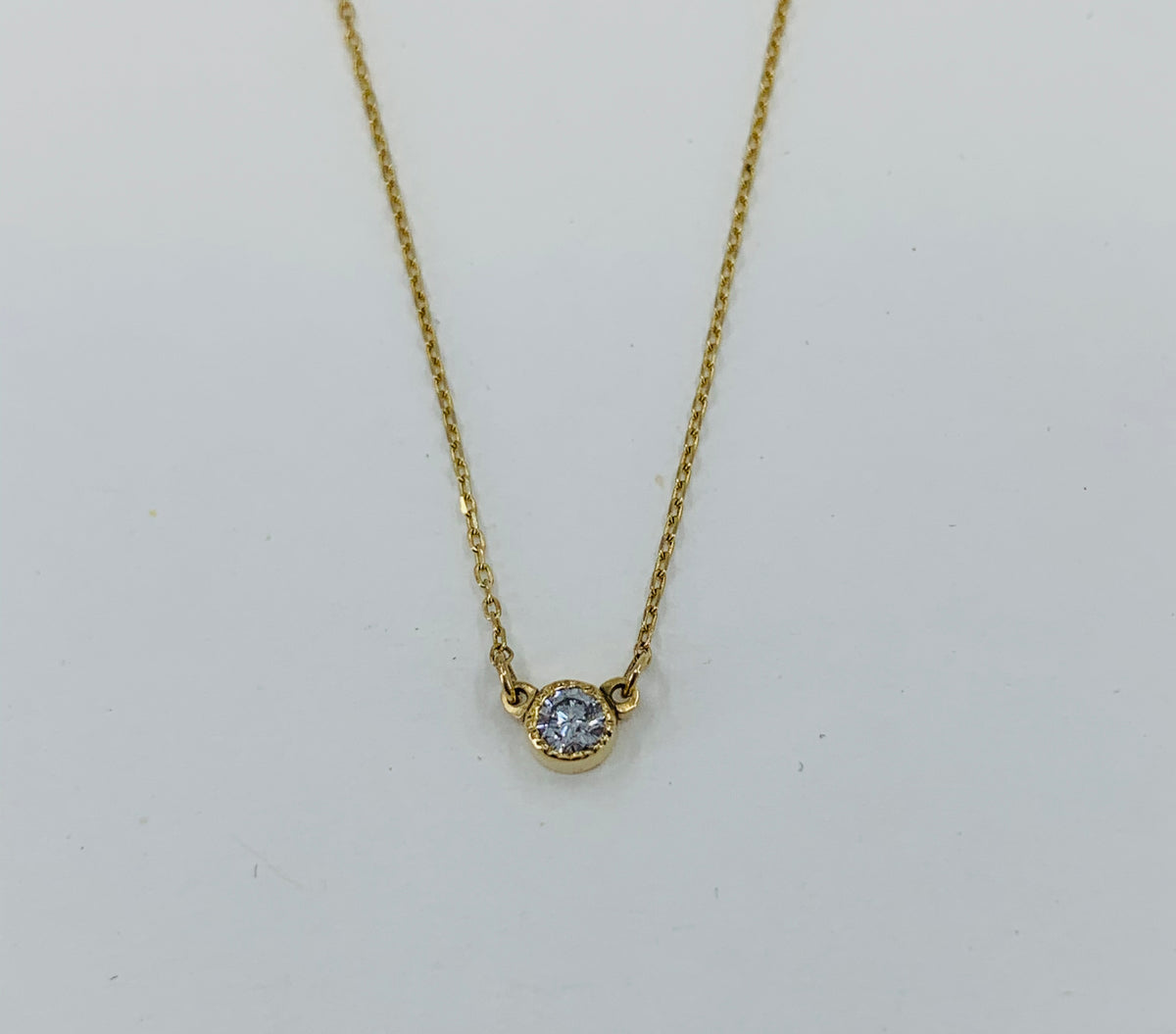 14k yellow gold diamond solitaire necklace. Diamond is a round brilliant cut diamond weighing 0.10cts G color and SI1 clarity....