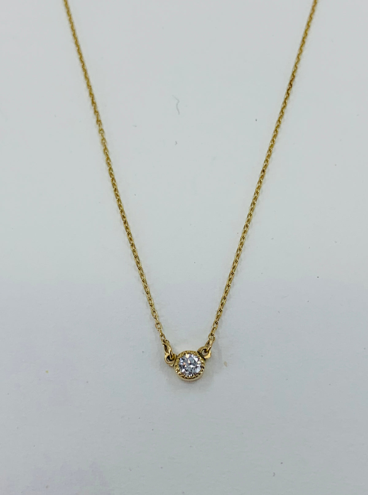 14k yellow gold diamond solitaire necklace. Diamond is a round brilliant cut diamond weighing 0.10cts G color and SI1 clarity. Attached to an 18” yellow gold cable chain