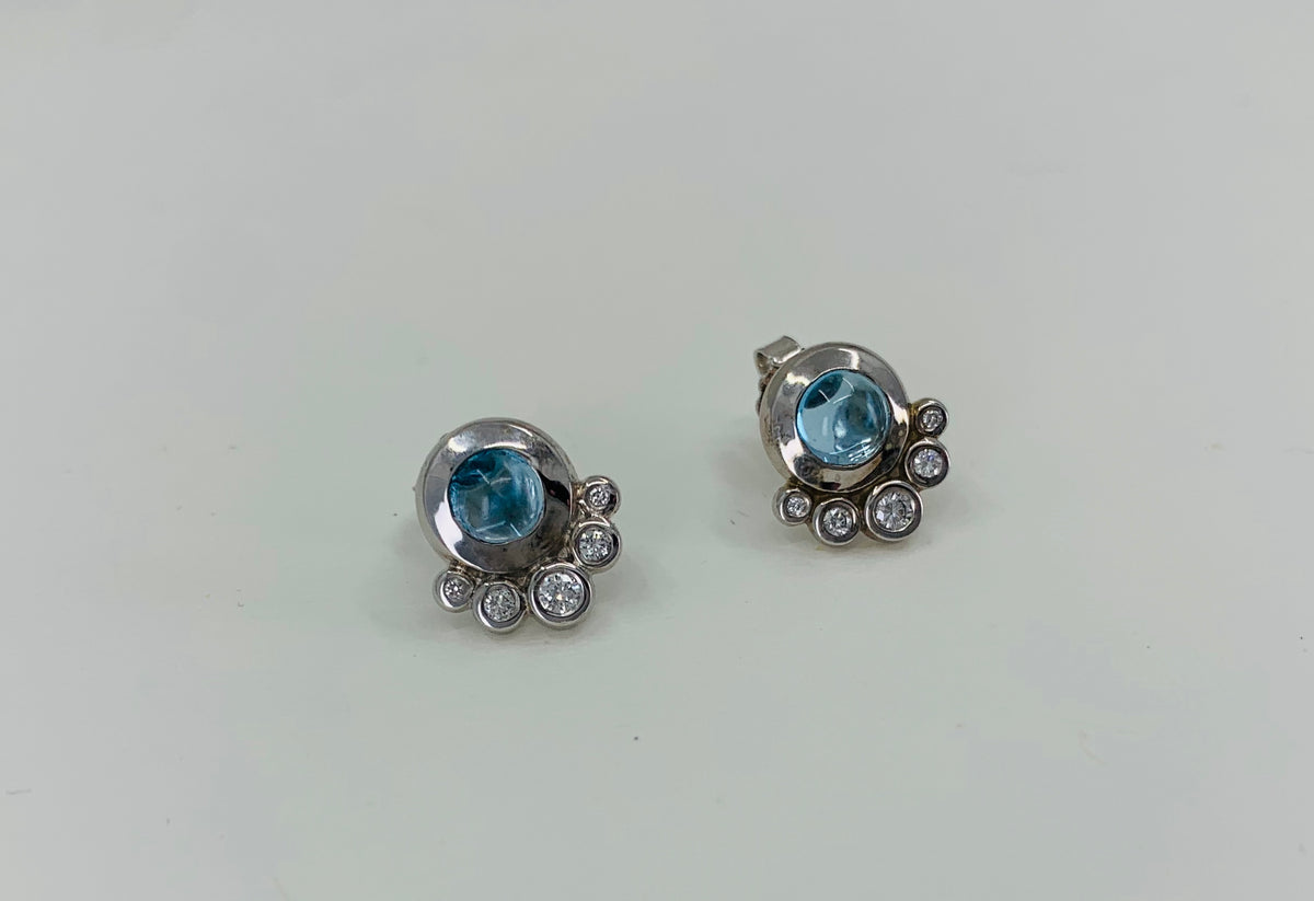 14k white gold blue topaz and diamond earrings. There are two cabochon blue topaz earrings weighing 1.11cts total and 10 round brilliant cut diamonds weighing 0.11cts total.