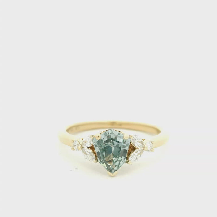 This exquisite ring features a stunning aquamarine gemstone, elegantly set in a delicate gold band. The central stone is flanked by sparkling diamonds, adding a touch of brilliance and sophistication. Perfect for special occasions or as a timeless gift, this ring embodies elegance and grace.