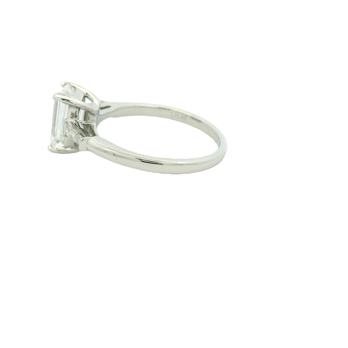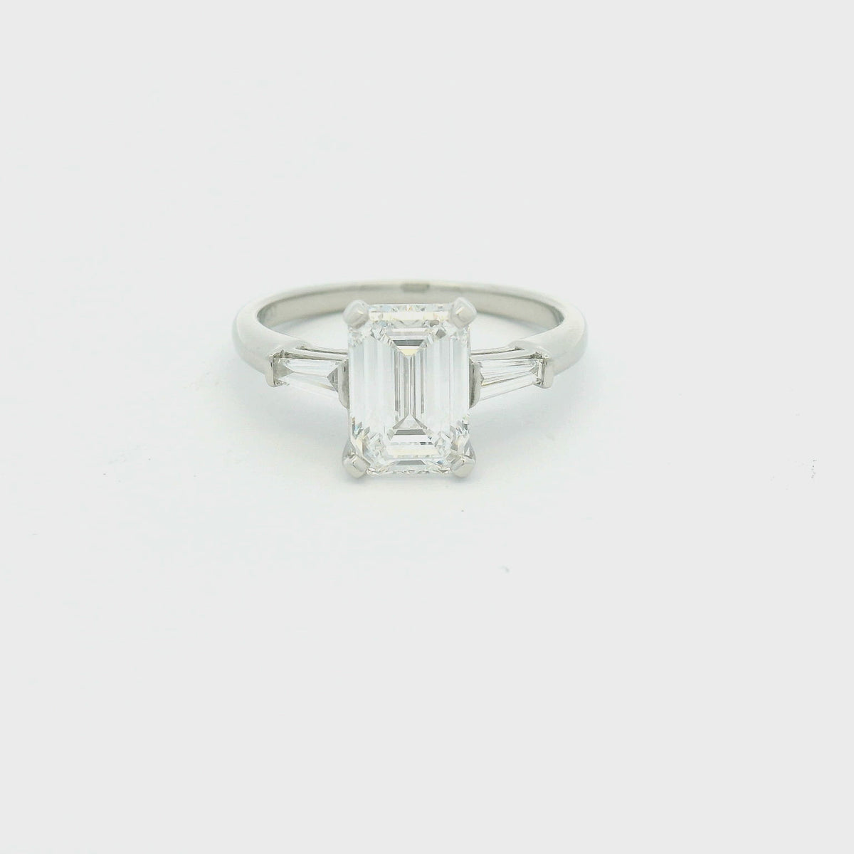 Platinum three stone engagement ring with 2.25ct lab grown emerald cut and lab grown tapered baguettes.