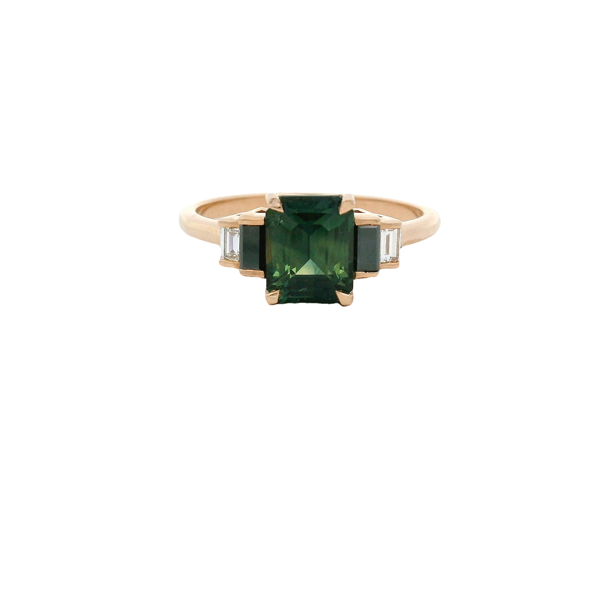 This exquisite ring features a stunning green gemstone at its center, flanked by two sparkling baguette diamonds. Set in a...
