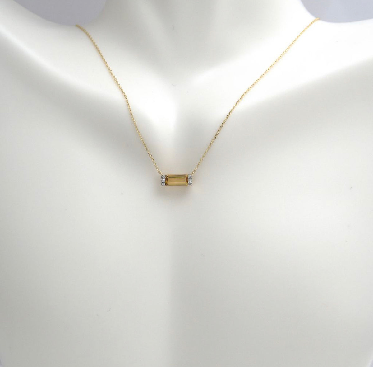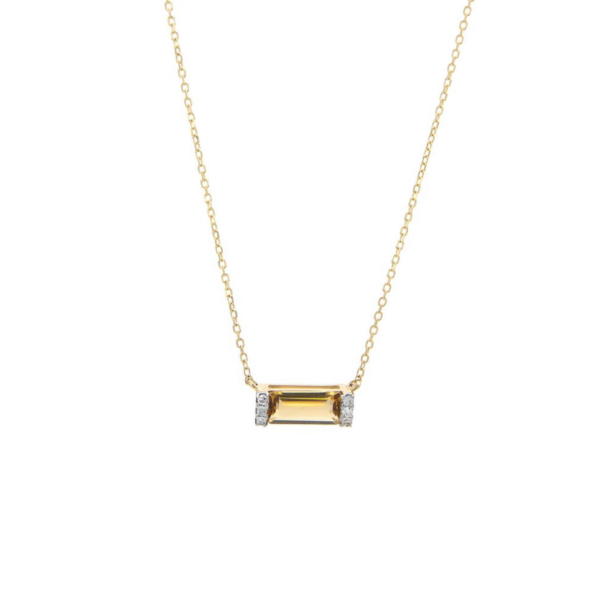 14k yellow gold rectangular bar pendant. Citrine weights 0.47cts and measures 9x3.5mm with 0.03cts of diamonds.