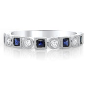 Made of white gold, this ring features a geometric design complete with milgrain detailing. Round cut white diamonds, totaling to 0.20 carats, pop against rich, blue sapphires that total to 0.29 carats.