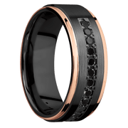 Zirconium with Satin , Polish Finish and 14K Rose Gold Inlay - 8 mm wide/Flat Grooved Edges/Zirconium band with a Half Eternity arrangement of .03 carat Round Black Diamond stones in a Bead setting and featuring two 1 mm Edge inlays of 14K Rose Gold - TCW 0.51ct.